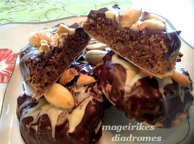 - Τα βάζουμε το ενα δίπλα στο άλλο επάνω σε λαδοκολλα, βάζουμε στην μέση λίγη απο την άσπρη σοκολάτα, κανουμε με ενα ξυλακι σχέδιο και βάζουμε επάνω μερικά αμύγδαλα.