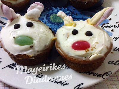 - Χτυπάμε όλα τα υλικά φτιάχνοντας ένα πηχτό γλάσο. Για τα λαγουδάκια αφού κάλυψα τα κεκάκια με το γλάσο έβαλα δυο marshmallows για αυτάκια, σταγόνες σοκολάτας για μάτια και μια ζελεδένια καραμελίτσα για στόμα.