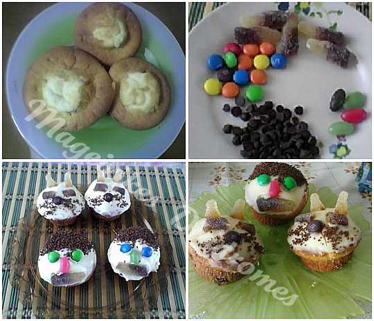- Για τις γατούλες έκοψα μεγάλα ζελεδάκια στη μέση και τα έβαλα για αυτιά και μάτια, τα μουστάκια τα έκανα με τρούφα αλλά θα φαίνονται πολύ καλύτερα αν λιώσετε λίγη κουβερτούρα και τα σχεδιάσετε, στα υπόλοιπα έβαλα τρούφα για μαλλιά, m&ms για μάτια, καραμελίτσα για μύτη και ζελεδάκι για στόμα.