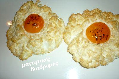 - Χτυπάμε τα ασπράδια σφιχτή μαρέγκα ,προσθέτουμε απαλά την παρμεζάνα.