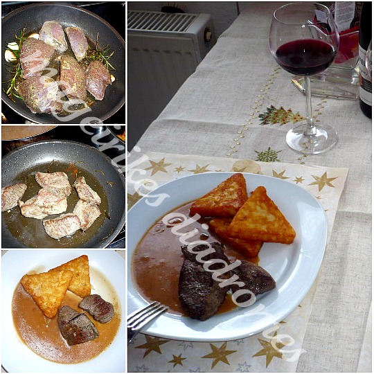 - Τηγανίζουμε τά φιλέτα αρνιών στό ελαιόλαδο μέ τίς 3 σκ σκόρδου καί τά 2 κλωναράκια δεντρολίβανο για μόνο 2 λεπτά