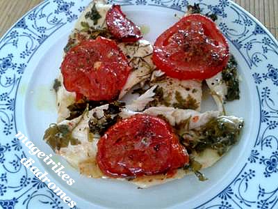 - Κόβουμε σε φέτες τις ντομάτες μας και βάζουμε από μια φέτα σε κάθε φιλέτο ψαριού,ρίχνουμε και τον μαϊντανό ψιλοκομμένο.