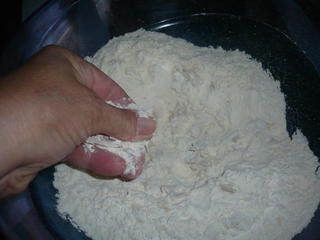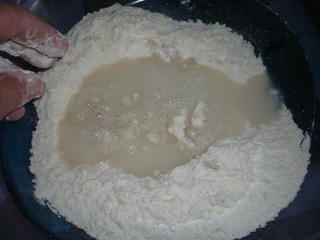 Βαζουμε το αλευρι σε λεκανη του μιξερ, κανουμε μια λακουβιτσα, ανακατευουμε την μαγια με το μελι να αραιωσει και την ριχνουμε στην λακουβιτσα. Ριχνουμε το νερο και ανακατευουμε λιγο να παρει λιγο αλευρι και να γινει ενας χυλος.