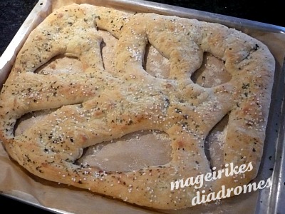Το βαζουμε σε μια λαμαρινα με λαδοκολλα, ραντιζουμε με νερο και πασπαλιζουμε με σουσαμι, αν θελουμε και λάδι. Αναβουμε τον φουρνο στο επανω κατω στους 250 βαθμους. Σκεπαζουμε τη ζυμη με μια πετσετα κουζινας καθαρη και αφηνουμε να ησυχασει η ζυμη για 30 λεπτα. Ψηνουμε 15 λεπτά στους 250 ° C μεχρι να παρει ενα ροδινο χρωμα.
