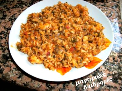 - Προσθέτουμε τη ντομάτα, το ζουμί από τις γαρίδες με αναλογία 1 φλιτζάνι ρύζι με 3 φλιτζάνια ζουμί. Αν χρειαστεί προσθέτουμε νερό. Αφήνουμε να βράσουν όλα μαζί και τότε ρίχνουμε το ρύζι, τ\' ανακατεύουμε με πιρούνι και τ\' αφήνουμε να ψηθεί κατεβασμένο σε σιγανή φωτιά. Αν θέλουμε σερβίρουμε το πιλάφι σε φόρμα και όταν το ξεφορμάρουμε γαρνίρουμε με τις γαρίδες που έχουμε κρατήσει με το κέλυφος.