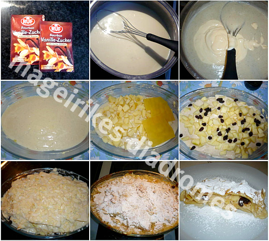 μετά μήλα , σταφίδες και πασπαλίζουμε με λίγη κανέλλα . Ραντίζουμε με αμαρετο ή λικέρ καλβαντος . Σκεπάζουμε με τα φύλα λαζάνια , ξανά πάλι απο την αρχή και τελειώνουμε με κρέμα . Πασπαλίζουμε με λίγη κανέλλα και με τα αμύγδαλα .