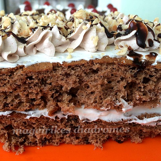 - Συναρμολογούμε: παντεσπάνι, σιρόπι, κρέμα, ετσι και το δεύτερο. Εγώ πήρα λίγη κρέμα, εβαλα κακάο για να αλλαξη λιγο το χρώμα και εκανα αστέρια με κορνε.