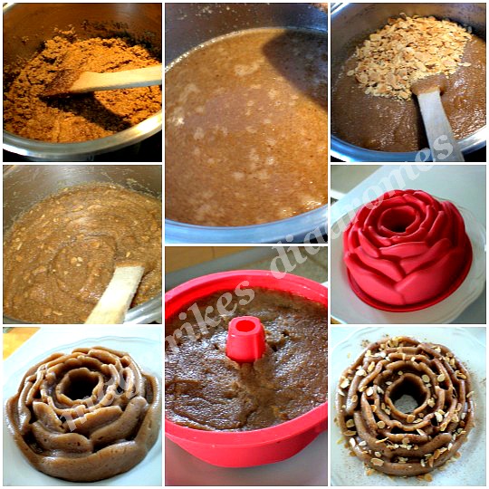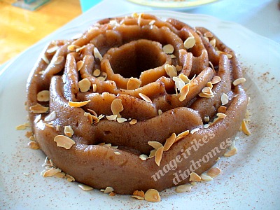 - Ξεφορμάρουμε και ρίχνουμε από πάνω κανέλλα και αμύγδαλα αν θέλουμε. Μπορούμε να σερβίρουμε και σε ατομικές μερίδες σε φορμάκια του μάφιν.