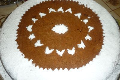 - Την αφήνουμε να κρυώσει και την φέρνουμε τούμπα σε πιατέλα .Πασπαλίζουμε ζάχαρη άχνη.