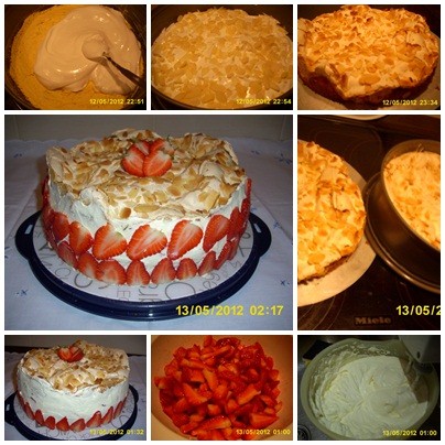 - Εχουμε βαλει ενα στεφανι γυρω γυρω και βαζουμε την κρεμα επανω στο πανεσπανι που εχουμε κανει, βαζουμε την κρεμα με τις φραουλες και από πανω βαζουμε το δευτερο.(το ποιο ωραιο). Την βαζουμε για δυο τρεις ωρες στο ψυγειο.