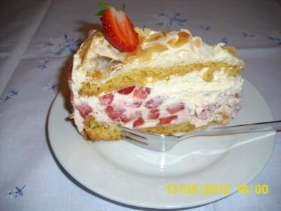 - Την παιρνουμε απο το ψυγειο και την πασπαλιζουμε με την κρεμα μεχρι επανω (Δειτε φωτο, )αν σας εχουν περισεψει φραουλες, κοψτε λεπτες φετες,και βαλτε της στην τουττα σας γυρω γυρω.