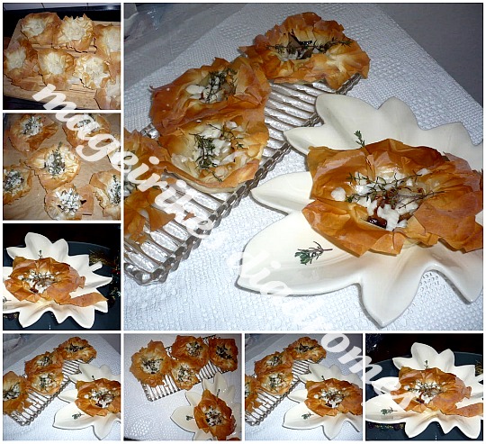 - Τά βγάζουμε απο τόν φούρνο, ρίχνουμε τά κρεμμυδια μεσα καί από πάνω πασπαλίζουμε μέ τό τυρι και βάζουμε σέ καθε τουρτακι και ενα κλαδακι θυμαρι