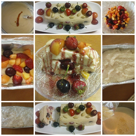 - Ρίχνουμε μια στρώση χαλβά ,συνεχίζουμε με τα φρούτα- ακτινίδια, φράουλες ,φρούτα δάσους, πάλι χαλβά και πάλι φρούτα, τελειώνουμε με ένα στρώμα χαλβά που το ισιώνουμε με τη ράχη ενός βρεγμένου κουταλιού. Σκεπάζουμε με πλαστική μεμβράνη.