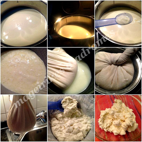 - Μετά αφού πήξει , το βάζουμε σε ένα τουλπανι που το έχουμε βρέξει πολυ καλα με κρύο νερό και το έχουμε στίψει καλα , το κρεμαμε για λιγο να φύγουν τα πολλα νερά του και μετά το βάζουμε έτσι όπως ειναι με το τουλπανι μεσα σε ένα τρυπητό και αφήνουμε να στραγγίξει πολυ καλα.