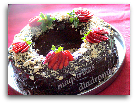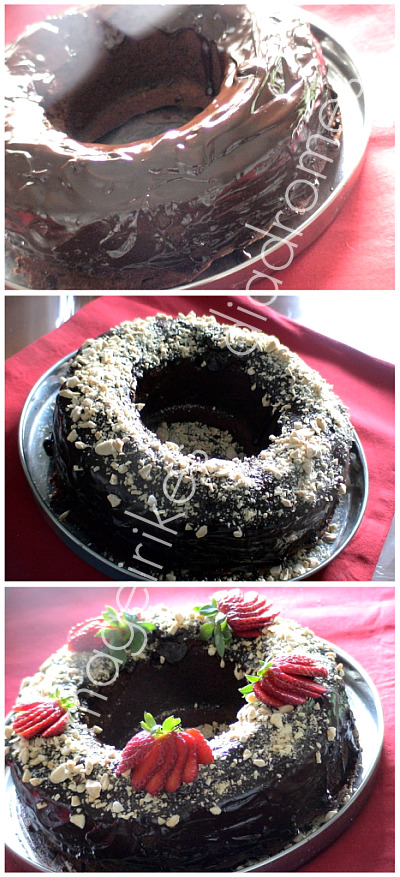 - Το στολίζω το κέικ με διάφορους τρόπους όπως περιχύνοντας μόνο με γλάσο ή με γλάσο και καβουρντισμένο αμύγδαλο και στολίζοντας το αν θέλουμε και με φράουλες, όπως βλέπετε στην