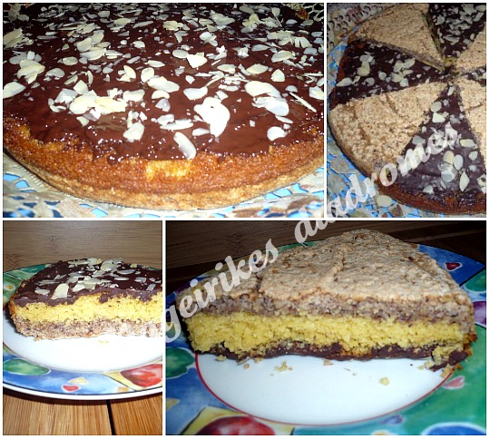 - Λιώνω την κουβερτούρα, αναποδογυρίζω το κέικ, την ρίχνω πάνω στο γλυκό και όταν κρυώσει καλα, κόβω κομμάτια και αναποδογυρίζω κάθε δεύτερο κομμάτι!