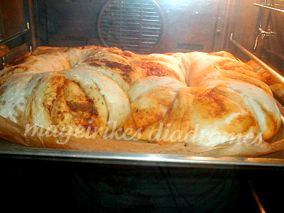 12. Το τυλίγουμε σε ρολό, το βάζουμε στην φόρμα το αλείφουμε λίγο με βούτυρο και το αφήνουμε να ησυχάσει για 10 λεπτά και μετά ψήνουμε για 50-60 λεπτά