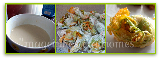 - Αλευρώνω τον κάθε ανθό και τον βουτώ μέσα στο χυλό.