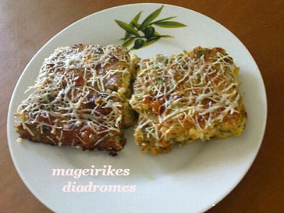 - Λαδώνουμε πολύ καλά ένα μέτριο ταψάκι, το αλευρώνουμε ή ρίχνουμε λίγο σιμιγδάλι, ρίχνουμε το μείγμα της πίτας,στρώνουμε καλά με ένα κουτάλι και ψήνουμε σε προθερμασμένο φούρνο στους 180ο για 45 λεπτά περίπου να ροδίσει.