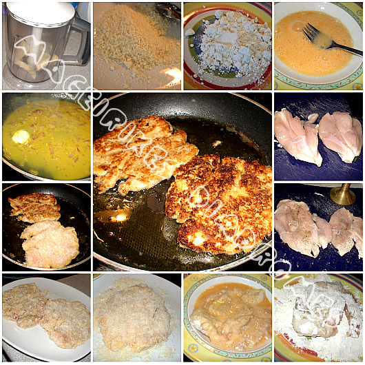- Παίρνουμε το κοτόπουλο και το περνάμε πρώτα από το αλεύρι, μετά από το αυγό και τέλος από το μείγμα τυριού. Το πατάμε καλά με τις παλάμες μας για να κολλήσει η ψίχα.