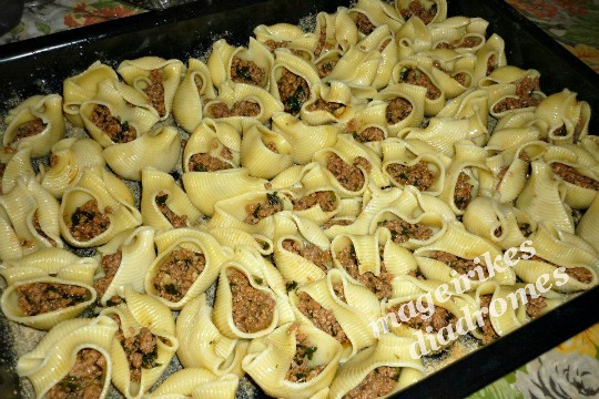 - Προθερμαίνουμε τον φούρνο στους 170 βαθμούς. Σε μεγάλο ταψί βουτυρωμένο και πασπαλισμένο με φρυγανιά ,τοποθετούμε τα κοχύλια . Βγάζουμε τα δαφνόφυλλα και το μπαχάρι από τον κυμά και βάζουμε 1 κουταλιά γέμιση στο κάθε κοχύλι,και τα σκεπάζουμε με το χτυπημένο αυγό. Πασπαλίζουμε με το κεφαλοτύρι.και από πάνω βάζουμε με βρεγμένο κουτάλι την μπασαμέλ.