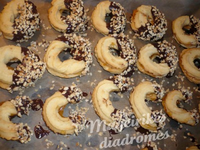 - Στη συνέχεια, περναμε τη ζύμη μέσα από μια μηχανή κοπής κιμά με την φορμιτσα του μπισκότου αστέρι. Κόψτε μικρά κομμάτια και καντε το σχήμα σε μισοφέγγαρα και κυκλους. Αν δεν εχετε μηχανη, βαζετε τη ζυμη στο κανονικο μηχανημα που κανετε τα μπισκοτακια.