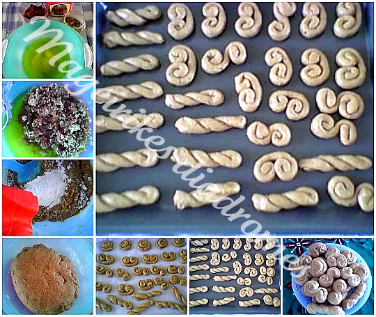 - Πλάθουμε κουλουράκια σε διάφορα σχέδια, ψήνουμε στον αέρα περίπου 20 λεπτά στους 170 βαθμούς ή σε απλό φούρνο στους 200β.για 30 λεπτά.