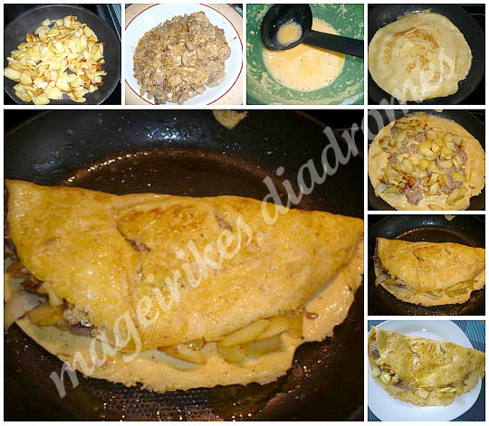 Ρίχνουμε επάνω την μισή δόση από τα μανιτάρια και τις πατάτες διπλώνουμε