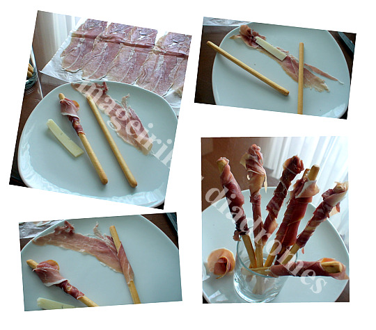 - Παίρνουμε το κάθε κριτσινάκι και τυλίγουμε πάνω της και λοξά το κάθε κομμάτι προσούτο.