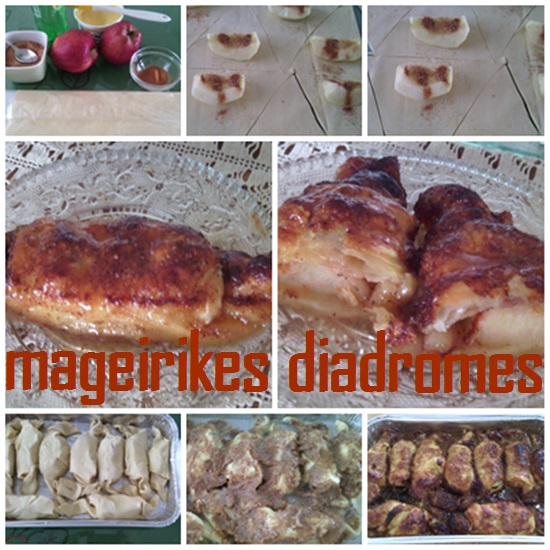 - Σε κάθε τρίγωνο βάζουμε από μια φέτα μήλο,πασπαλίζουμε με κανέλα και ζάχαρη,τυλίγουμε από την φαρδιά πλευρά προς την στενή σε κρουασάν.