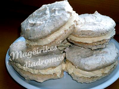 - Ψήνουμε 50 λεπτά σε θερμοκρασία 60 βαθμούς. Όταν κρυώνουν, τις μαζεύουμε από το ταψί και κολλάμε δύο δύο με την κρέμα σαν ένα σάντουιτς. Αν θέλουμε, μπορούμε από πάνω να κάνουμε σχέδια (γραμμές, κλπ.) με λιωμένη σοκολάτα.
