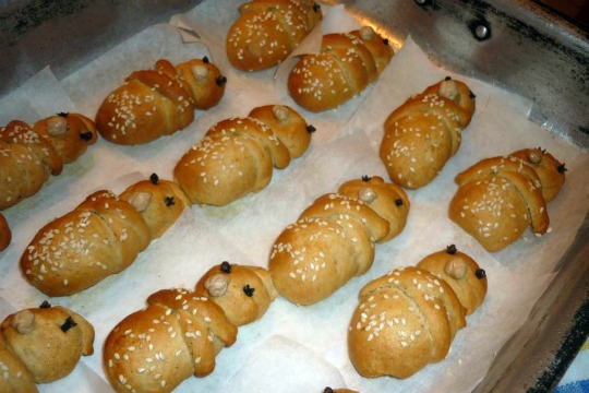 - Τοποθετούμε με το χαρτί στο ταψί.Δεν ξεχνάμε τα σταυρωμένα χέρια του Λάζαρου και το σκέπασμα στο κεφάλι του .
