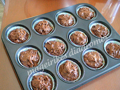 - Σε φόρμα για μάφιν βάζουμε θηκούλες χάρτινες χωρίς να βουτυρώσουμε . Γεμίζουμε τις χάρτινες αυτές θηκούλες μέχρι πάνω και ψήνουμε σε φούρνο στους 180ο για 25 με 30 λεπτά . Δοκιμάζουμε με την οδοντογλυφίδα και αν βγει στεγνή , τότε είναι έτοιμα τα μάφιν μας .