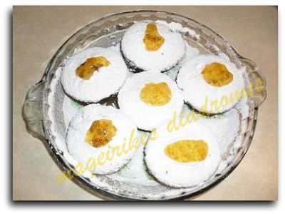Από πάνω και στο κέντρο της ζύμης βάζουμε μισό κουταλάκι μαρμελάδα και καλύπτουμε με μια ακόμα κουταλιά ζύμης.