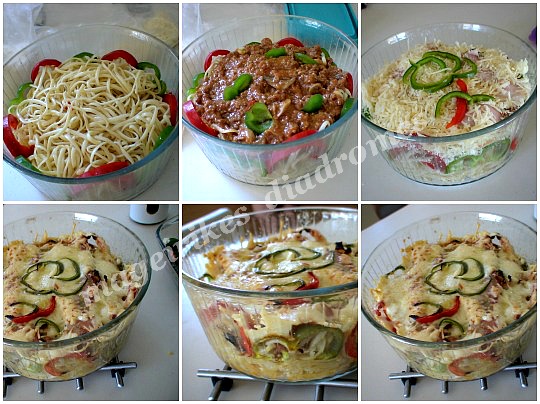 Μπορούμε να ετοιμάσουμε τα υλικά μας από την αρχή. Βράζουμε τα μακαρόνια μας κανονικά και τα βουτυρώνουμε. Φτιάχνουμε τον κιμά μας μπολονέζ (δηλ. για μακαρόνια με κιμά). Τα υπόλοιπα όπως η συνταγή.