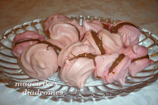 - Χτυπάμε σε μεταλλικό μπόλ τα ασπράδια ,ρίχνουμε σαν βροχή την ζάχαρη ,μέχρι να γίνει σφιχτή μαρέγκα, ρίχνουμε την άχνη και ανακατεύουμε με σπάτουλα απαλά και βάζουμε με το κουτάλι αραιά σε ταψί με λαδόκολλα κουταλιές.