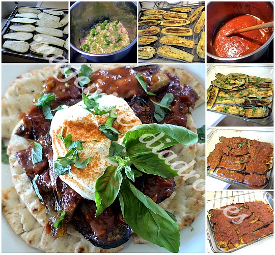 - Πλένουμε τις μελιτζάνες, τις σκουπίζουμε και αφαιρούμε μερικές φλούδες από το εξωτερικό της μελιτζάνας. Τις κόβουμε φέτες και τις αλατίζουμε. Τις βάζουμε σε λαμαρίνα του φούρνου, τις λαδώνουμε και τις ραντίζουμε με λίγο ξερό βασιλικό. Τις ψήνουμε στο γκριλ του φούρνου από τη μια μεριά μέχρι να ροδίσουν και τις γυρίζουμε και από την πίσω πλευρά , να ροδίσουν επίσης.