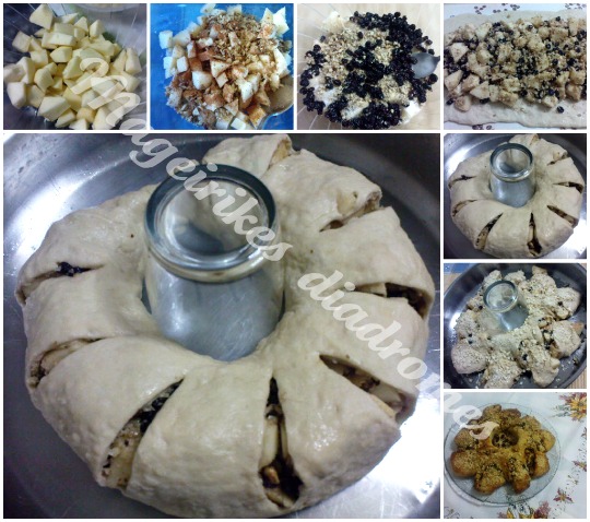 - Σκεπάζουμε και αφήνουμε για άλλα 15\' να ξεκουραστεί,αλείφουμε με χτυπημένο αυγό ή λάδι και ψήνουμε στους 180β. για μισή ώρα να ροδίσει.