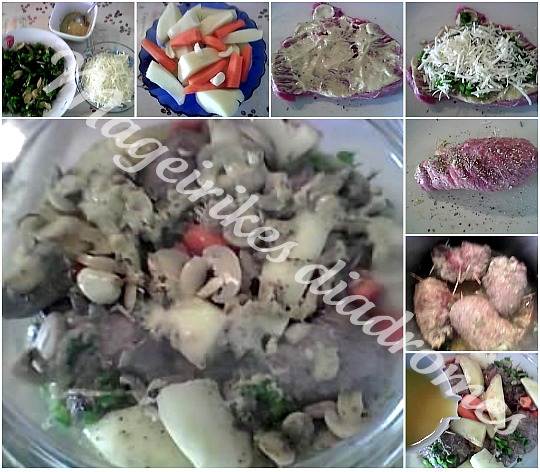 - Τα σοτάρουμε σε λάδι ή βούτυρο καλά από όλες τις πλευρές. Το μεταφέρουμε σε γάστρα ή ταψάκι με καπάκι, ρίχνουμε τους χυμούς, αλατοπίπερο,1 ποτήρι νερό, λάδι και γύρω γύρω τις πατάτες, καρότα και μανιτάρια.