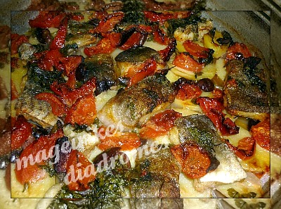 - Σε μέτριο ταψί στρώνουμε το κρεμμύδι και το σκόρδο. Από πάνω βάζουμε τις πατάτες ,τα κομμάτια του μπακαλιάρου, τις ντομάτες τις ελιές ,το μαϊντανό, το πιπέρι το κρασί και το νερό.