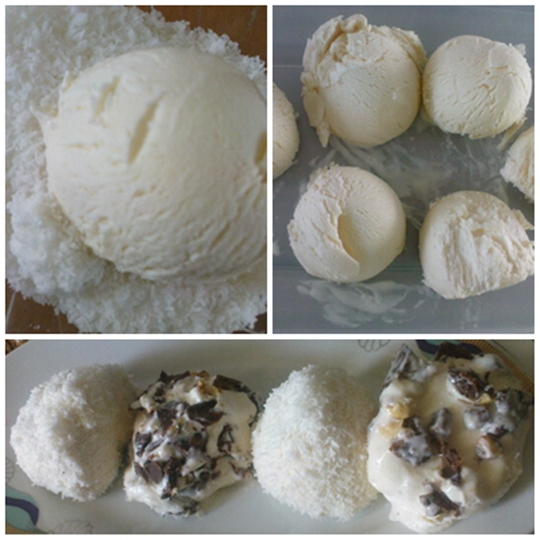 - Βγάζετε τις παγωμένες μπαλίτσες παγωτού και τις ρίχνετε μία μία,τις μισές στο μπολ με την καρύδα και τις υπόλοιπες στο μπολ με την τριμμένη σοκολάτα,τις καλύπτετε καλά και ξανά στην κατάψυξη μέχρι να τις σερβίρετε.