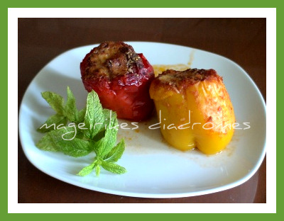 - Κλείνω και βάζω στο πυρέξ τις πιπεριές και περιχύνω λάδι, χυμό από 2 ντομάτες, αλάτι και προς το τέλος του ψησίματος, ραντίζω την επιφάνεια με τυρί παρμεζάνα και ροδοκοκκινίζει.