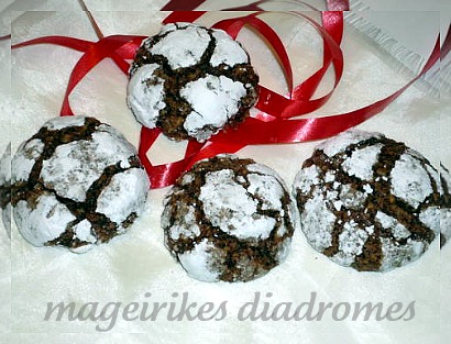 - Μετά κάνουμε μικρά μπαλάκια τά τυλίγουμε στήν άχνη καί τά τοποθτούμε σέ ταψί με λαδόκολα