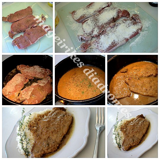 - Κόβουμε σε λεπτά φιλετίνια το κρέας , κάθετα στις ίνες του ή κόβουμε μπριζόλες κόντρα ή σπαλομπριζόλα χωρίς κόκκαλο λεπτές κι αυτές. Τα αλατοπιπερώνουμε και τα αλευρώνουμε, τινάζοντας το πολύ αλεύρι.