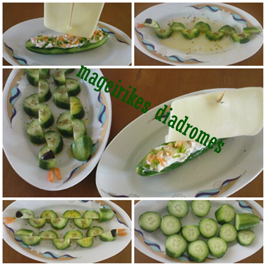 - Για τα φιδάκια: Κόβουμε φέτες κάθε αγγουράκι και κάθε φέτα στην μέση. Συναρμολογούμε βάζοντας αντίθετα κάθε φετούλα.