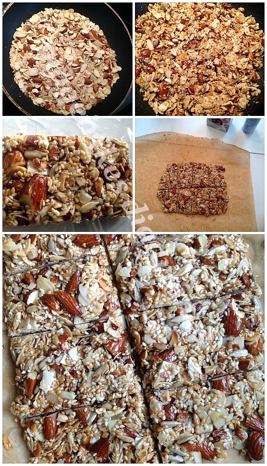 - Στο ίδιο τηγανι βάζουμε το μέλι και το λιώνουμε μέχρι να παρει μια βράση και να κάνει φουσκάλες. Ρίχνουμε από πάνω τους ξηρούς καρπούς ανακατεύοντας συνεχώς σε χαμηλή φωτιά, πρέπει οι ξηροί καρποί να είναι παντού και να καλύπτουν πλήρως το μέλι ετσι θα γίνει κριτσανιστό.