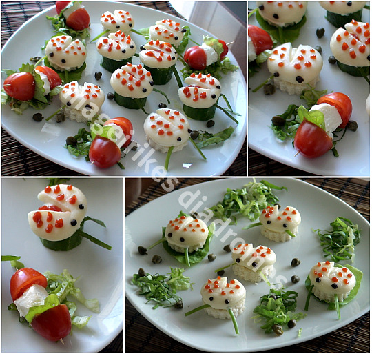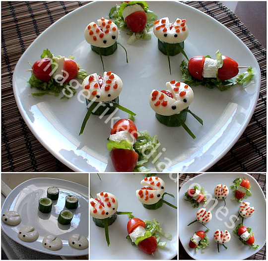 - Πάνω στο αγγούρι τοποθετούμε το τυράκι και κάνουμε ότι και πριν στις πασχαλίτσες με το ψωμί.