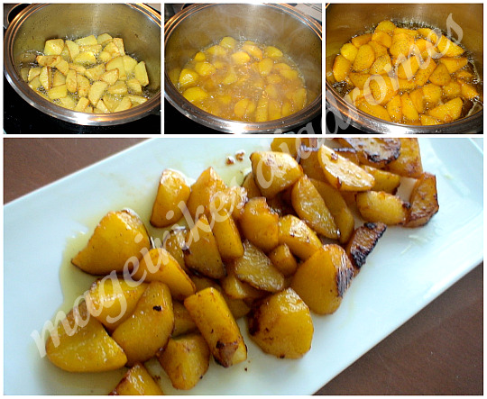 Δεν ανακατεύουμε τις πατάτες, αφού ξεσκεπάσουμε την κατσαρόλα και μετά, παρά μόνο κουνώντας την κατσαρόλα, γιατί είναι μελωμένες και μαλακές και θα διαλυθούν.