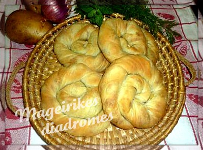 - Το χωρίζουμε σε 12 μπαλάκια και τα πλάθουμε. Τα ανοίγουμε φύλλα και αλείφουμε με λάδι, σκορπάμε επάνω την πατάτα (1/12 για κάθε φύλλο.)