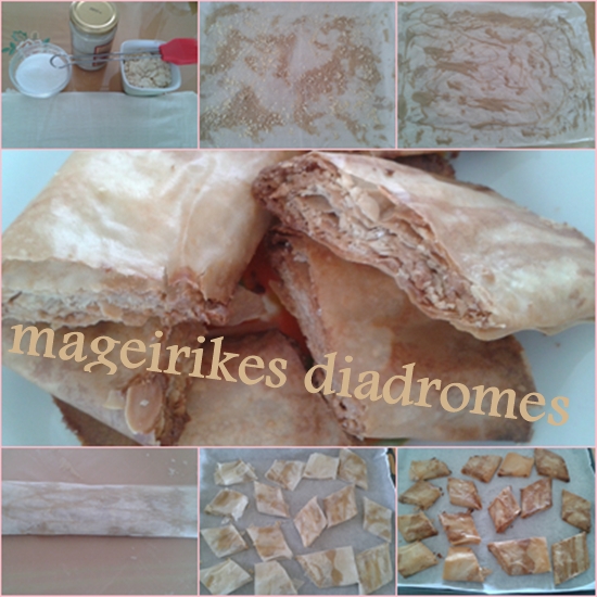 - Με το ίδιο τρόπο φτιάχνουμε και τα άλλα τρία φύλλα βάζοντας ανάμεσα ταχίνι-ζάχαρη-καρύδια, τυλίγουμε, κόβουμε και τα ψήνουμε στους 170ο για 10-15 λεπτά να ροδίσουν.